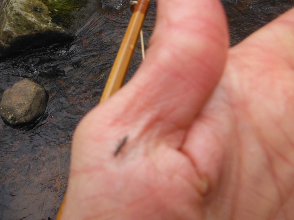 No rising fish detected, but a few good-sized midges were in the air, and a few very tiny stonefly nymphs were crawling on us.